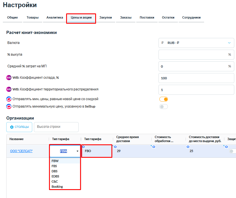 Преимущество SelSup: вы можете выбрать тип тарифа для каждой организации, и расчёты будут выполняться с учётом комиссии именно по выбранной схеме. Данные о комиссиях и тарифах подтягиваются автоматически по API маркетплейсов — это снижает риск ручных ошибок и помогает получать более точный финансовый прогноз.