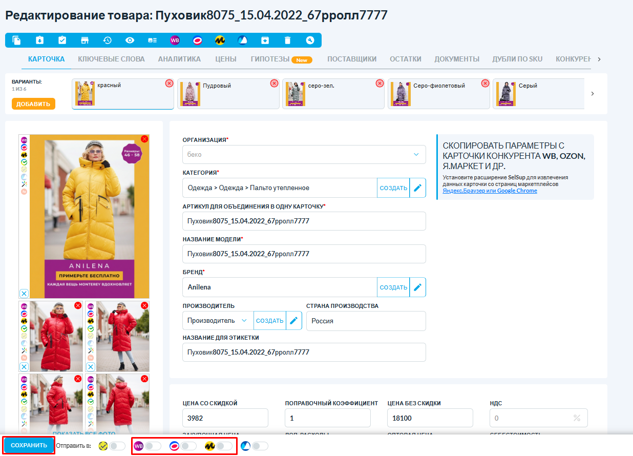 Пока вы редактируете изображение, вы можете одним кликом посмотреть, как оно будет выглядеть не только в карточке товара в SelSup, но и в каталогах Ozon и Wildberries.