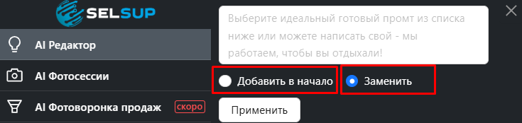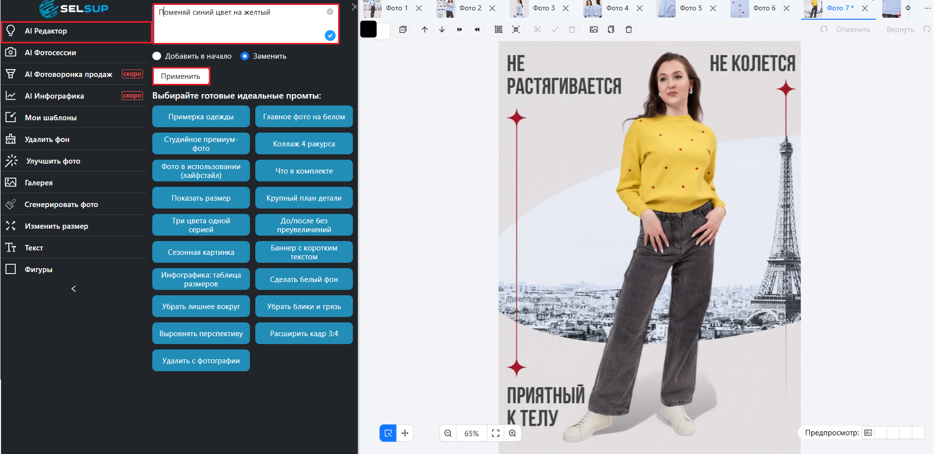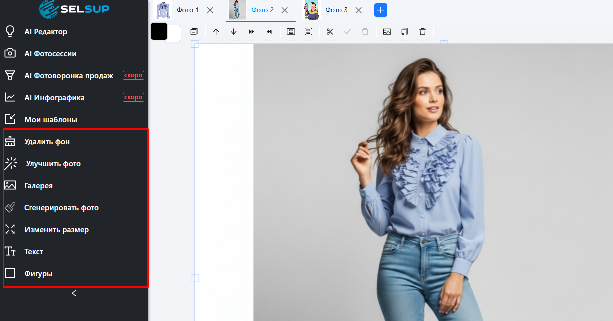 Наш новый фоторедактор — это мощный и при этом удобный инструмент, который станет вашим надежным помощником в создании продающих изображений. Он сочетает в себе скорость и магию ИИ, гибкость профессиональных настроек и уникальную функцию предпросмотра для маркетплейсов. Теперь вам не нужны дорогие подписки на сторонние сервисы — всё в одном месте, прямо в SelSup!