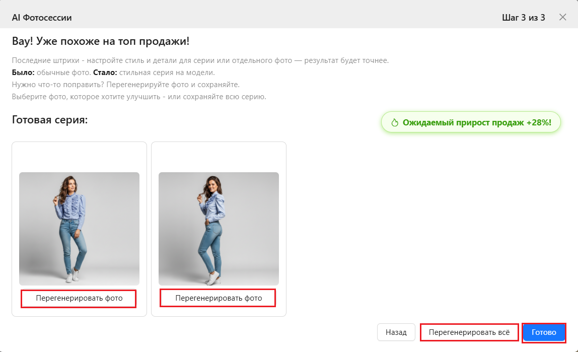 Если какое-то из сгенерированных фото вас не устраивает, вы можете нажать «Перегенерировать фото» и получить новый вариант изображения.