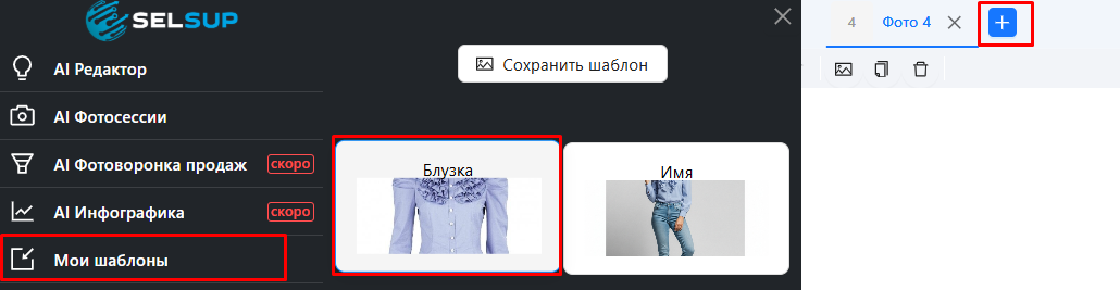 Вкладка «Мои шаблоны» позволяет сохранять изображения и использовать их повторно при дальнейшей генерации, чтобы ускорить работу и поддерживать единый визуальный стиль карточек товаров.
