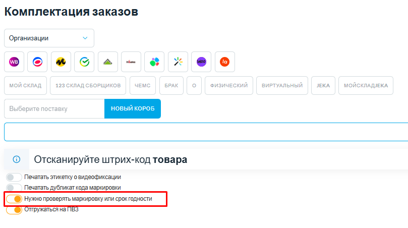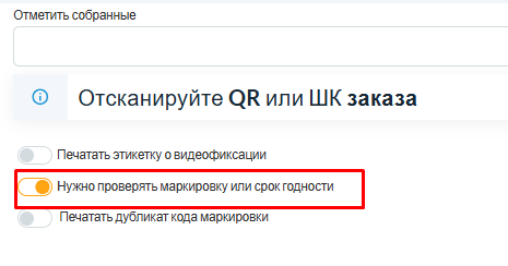 После этого перейдите в задание по комплектации и включите переключатель "Нужно проверять маркировку или срок годности"