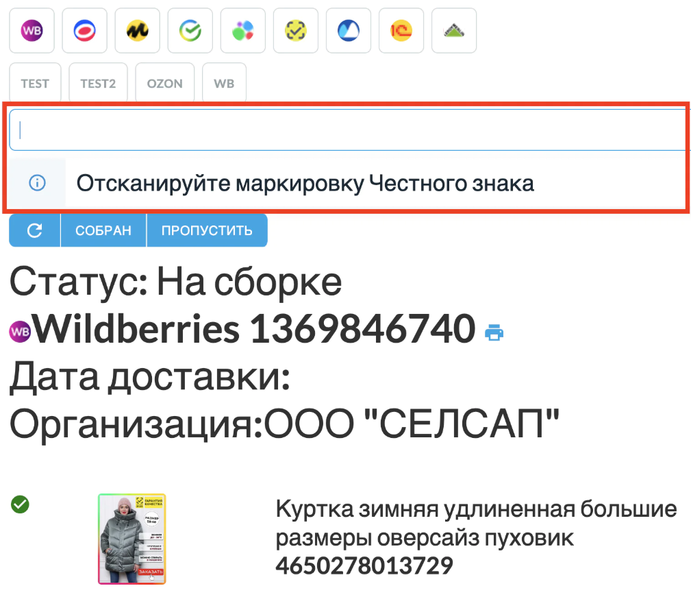 4. Сканируйте ШК товара, подбирается заказ, в котором содержится товар. Если товар подлежит маркировки, сканируйте код маркировки. Селсап прикрепляет код маркировки к заказу и отправляет в Озон.
