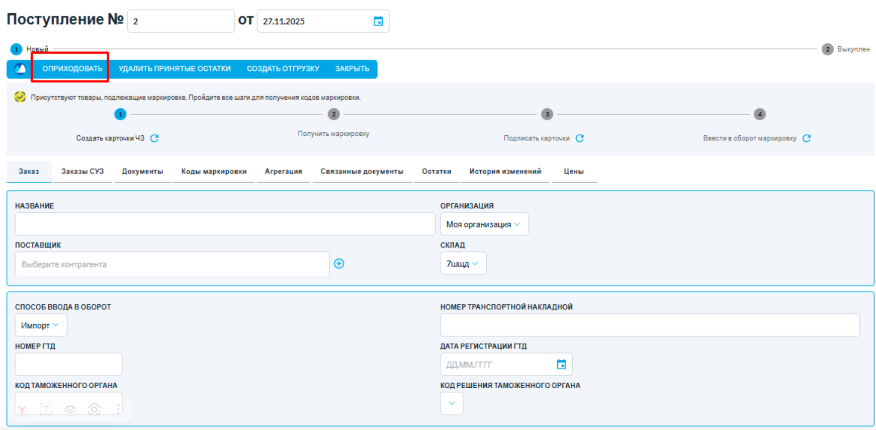 - Сохраните приемку на склад и нажмите "Оприходовать", чтобы остатки этих товаров были приняты на склад, а у остатков будет сохранен номер ГТД из приемки.
