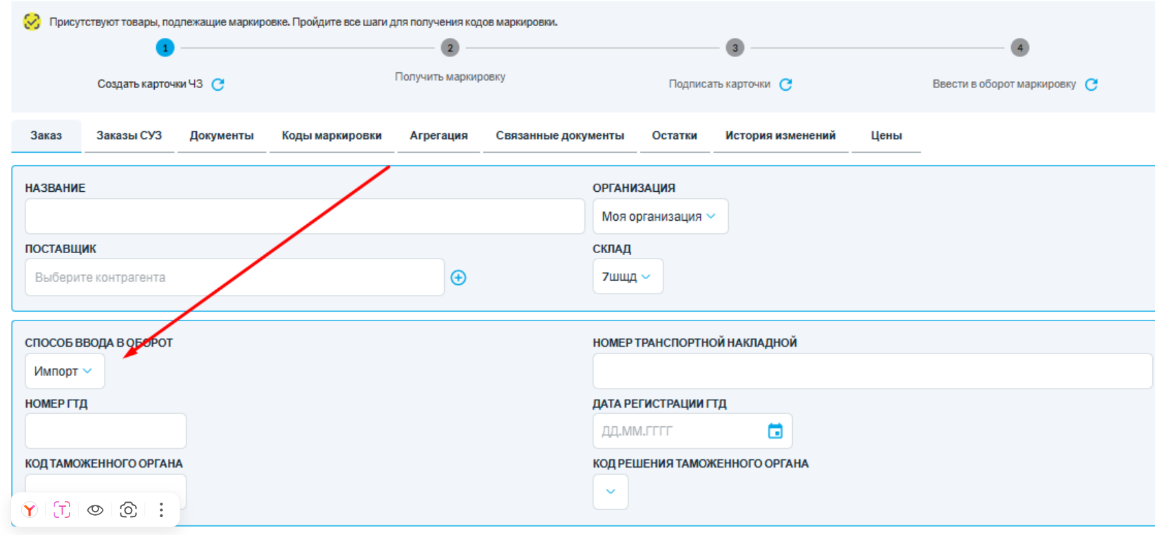- Первым этапом необходимо создать новую приемку на склад, указав способ ввода в оборот - Импорт, заполнив остальную информацию по ГТД и добавив товары, которые идут с указанным номером декларации.