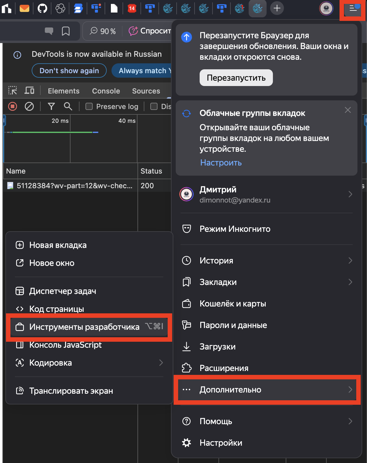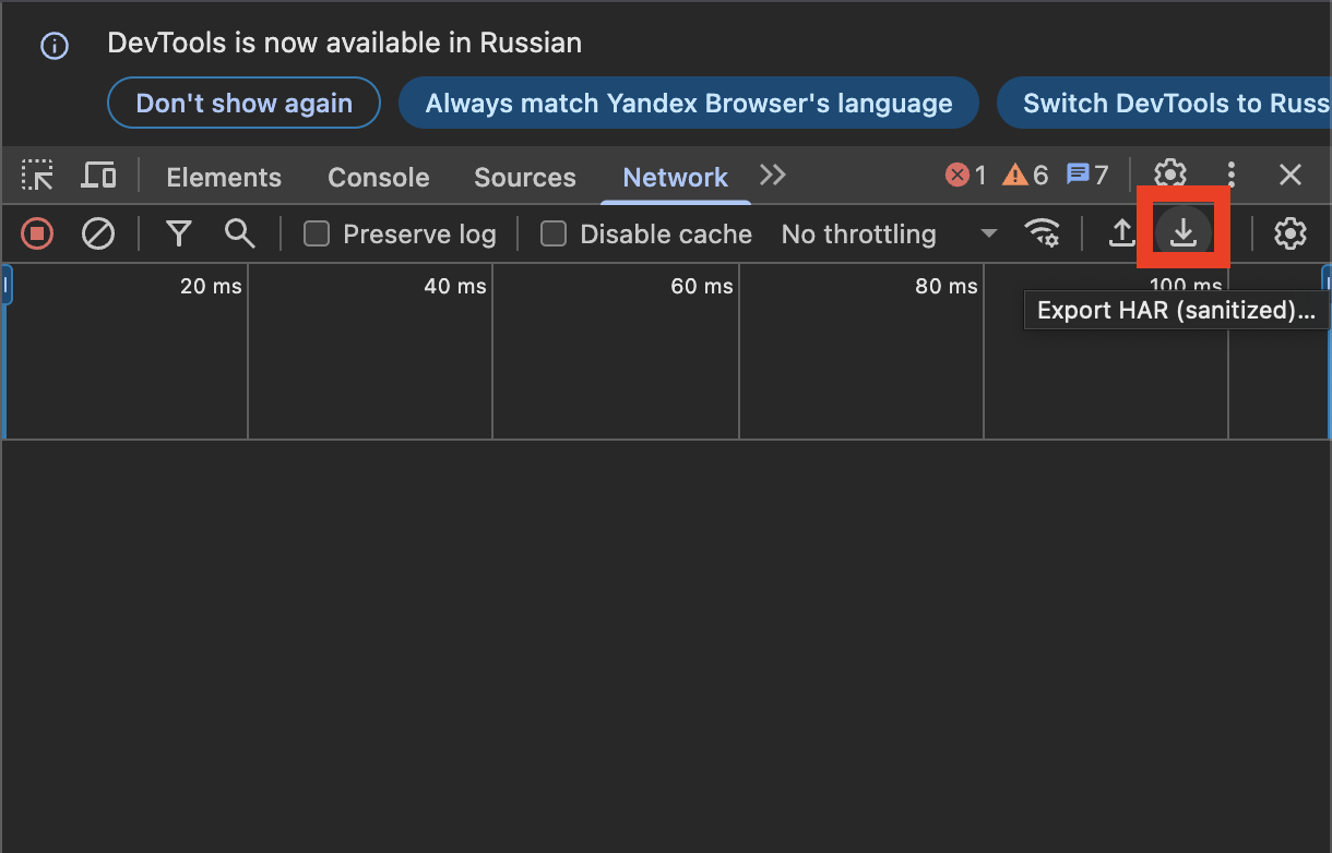 В случае ошибки необходимо записать всю информацию о запросах, которые отдали ошибку, в консоли разработчика они будут красные.