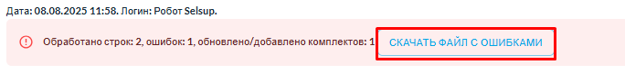 После загрузки файла с комплектами в SelSup система автоматически проверяет данные. Результат импорта может быть двух видов: