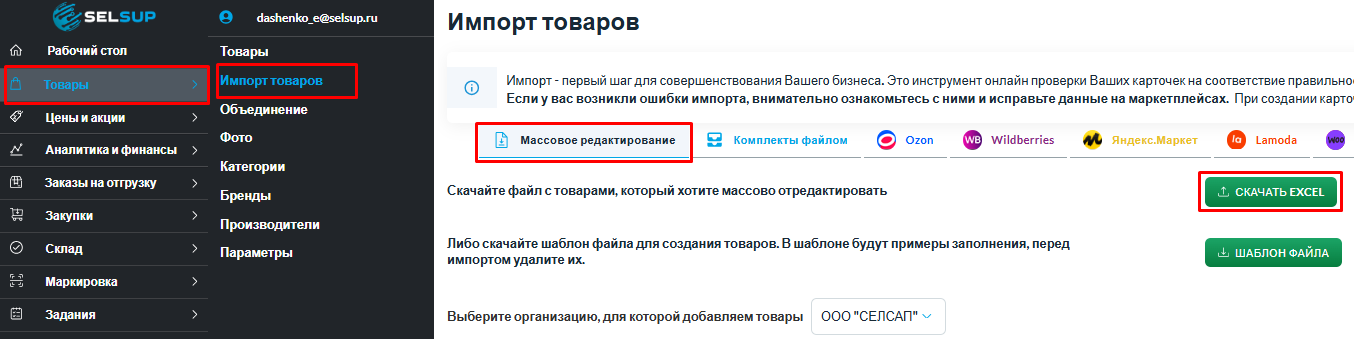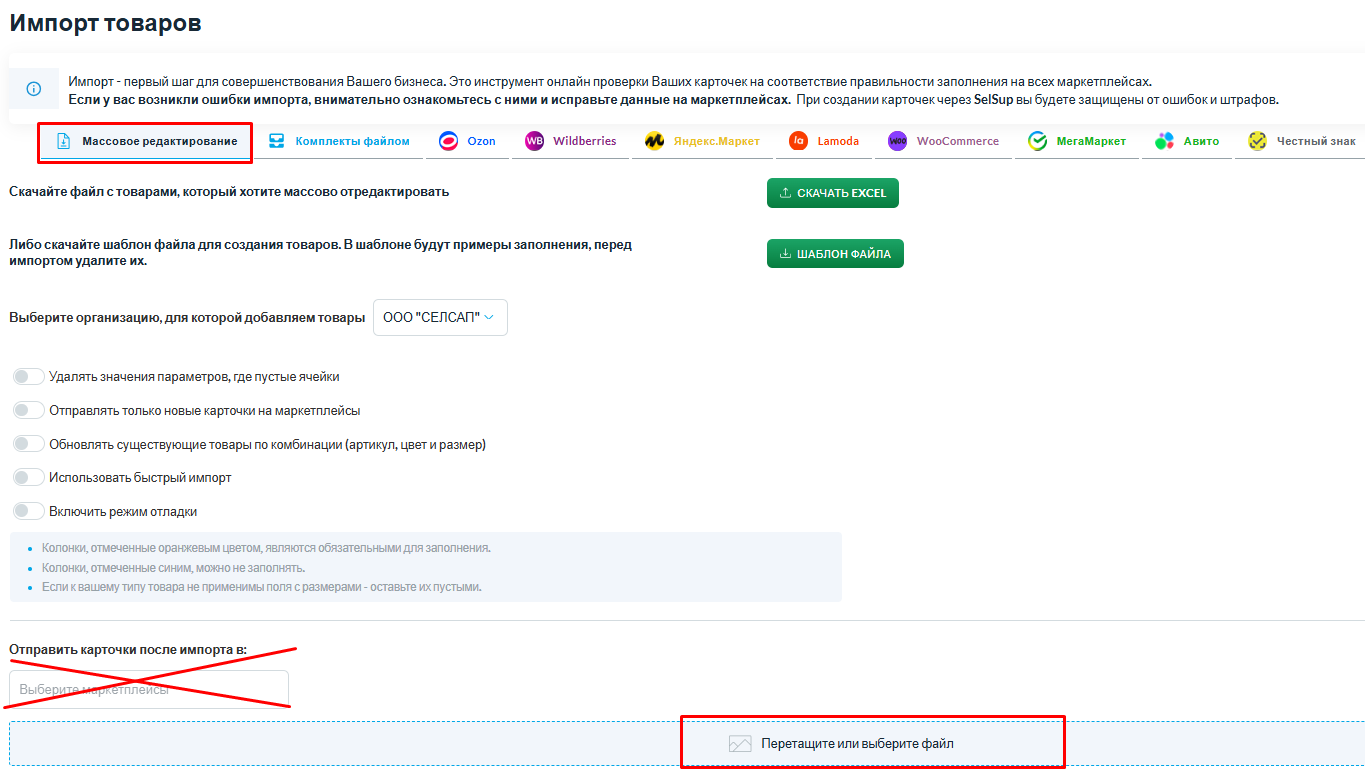 После изменений сохраните файл и загрузите его обратно в раздел Товары - Импорт товаров - Массовое редактирование в синее поле для загрузки файла. Выбирать маркетплейс при этом не нужно.