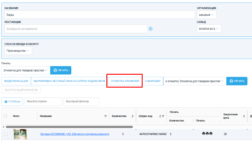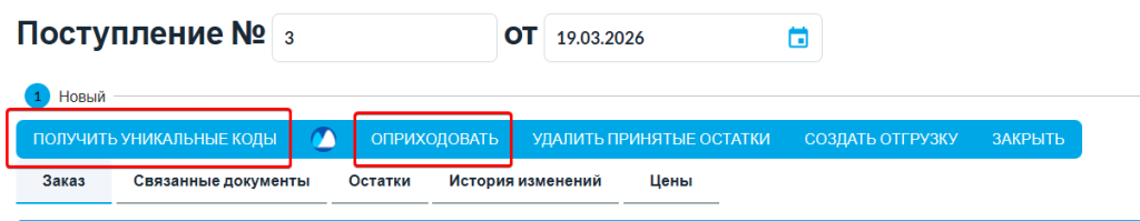 Если вы используете уникальные коды для партии товара, перед оприходованием нажмите кнопку «Получить уникальные коды». После этого в этикетке хранения будет указан уникальный код партии.