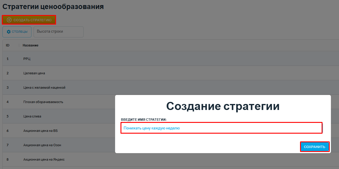 В этом разделе вы можете создавать свои стратегии, указывать их в отчетах аналитики и применять к разделу «Цены» для конкретных товаров.