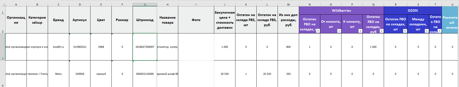 С маркетплейсов Wildberries, Ozon остатки могут забираться по API автоматически, но иногда даже у этих маркетплейсов по API отдаются неактуальные остатки на складах маркетплейсов FBO. В этом случае вы можете скачать остатки файлом и загрузить в SelSup. О том, как Вы можете это сделать, написано в нашей статье "Выгрузка остатков FBO файлом с маркетплейсов"