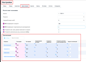 Логистика рассчитывается исходя из выбранного тарифа организации и габаритов товара. Тариф организации можно установить в разделе Настройки → Цены и акции → Организации.