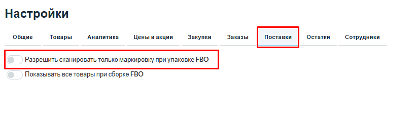 Также в настройках, можно включить тумблер Разрешить сканировать только маркировку при упаковке FBO. При его активации будет запрещено сканирование обычного штрихкода в задании — разрешена только проверка по маркировке.