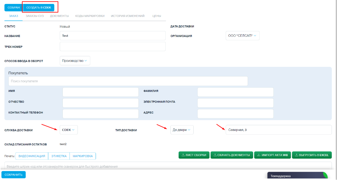 1. Для этого вернитесь в созданный заказ и заполните поле "Служба доставки", выберите CDEK.