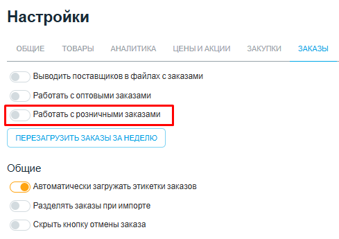 Шаг 1. Чтобы начать работать с розничными заказами перейдите в Настройки - Заказы и включить тумблер Работать с розничными заказами и нажмите Сохранить.