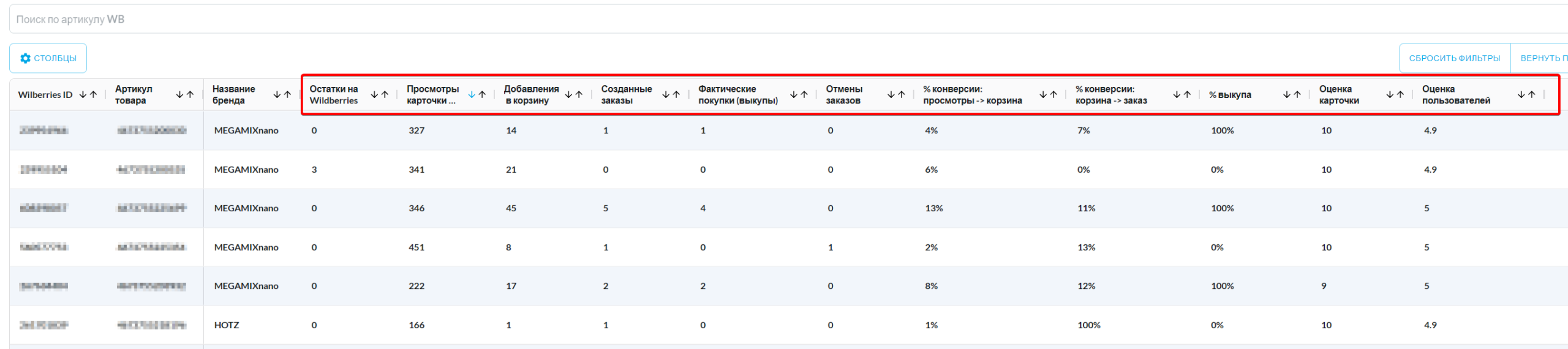 Отчёт фиксирует ключевые показатели по товару на каждом этапе пути покупателя, а также дополнительные параметры карточки.