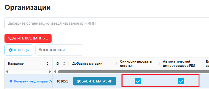 Если включена только одна из настроек, импорт заказов и синхронизация остатков не будет работать.