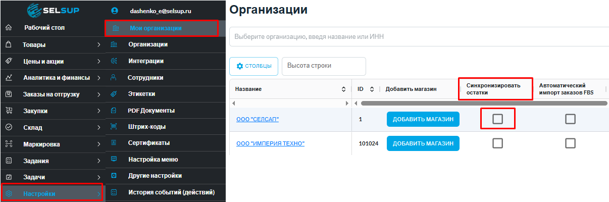 В разделе «Настройки» → «Мои организации» включить «Синхронизацию остатков».