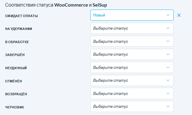 Например, статус «Ожидает оплаты» в WooCommerce можно связать со статусом «Новый» в SelSup, и аналогично для других статусов.