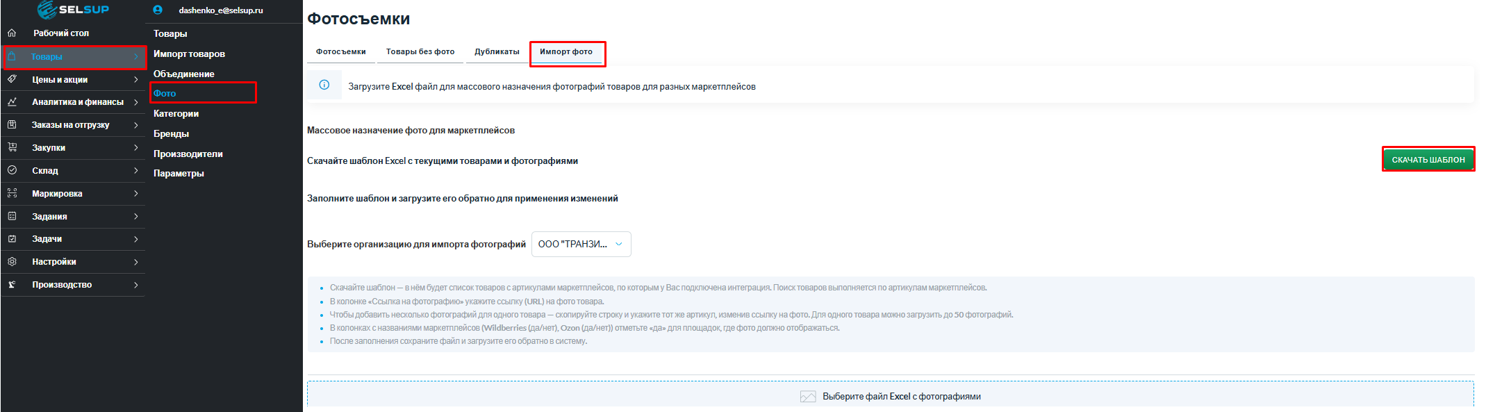 1.Перейдите в раздел «Товары» → «Фото» - «Импорт фото»и нажмите Скачать шаблон.