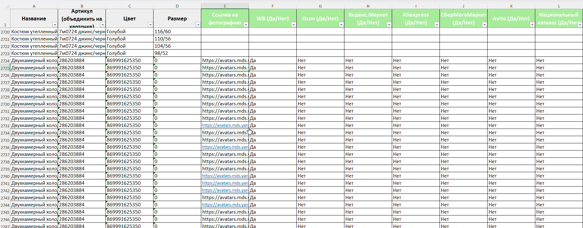 Вы получите Excel-файл со списком ваших товаров и артикулами маркетплейсов.