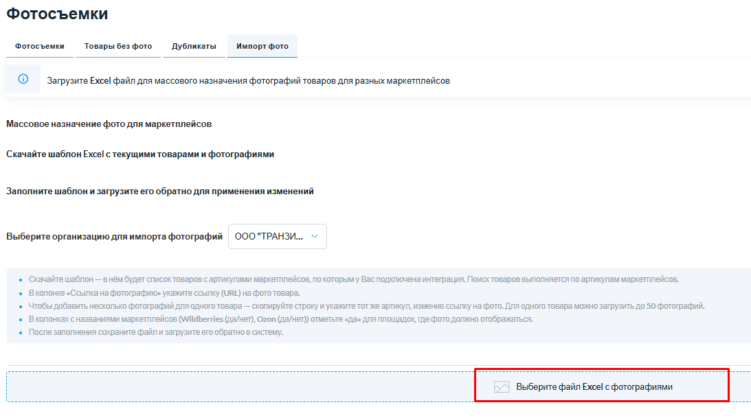 Загрузка фотосессий подходит для тех, кто работает с большим количеством артикулов или проводит фотосессии.
