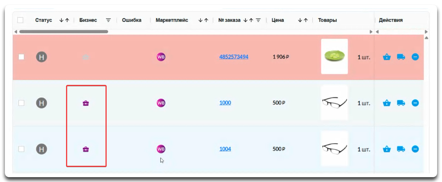 В SelSup в разделе Заказы на отгрузку - Со своего склада FBS для заказов от юридических лиц используется специальная пометка — значок портфеля в колонке «Бизнес».